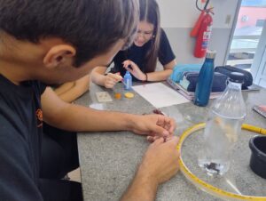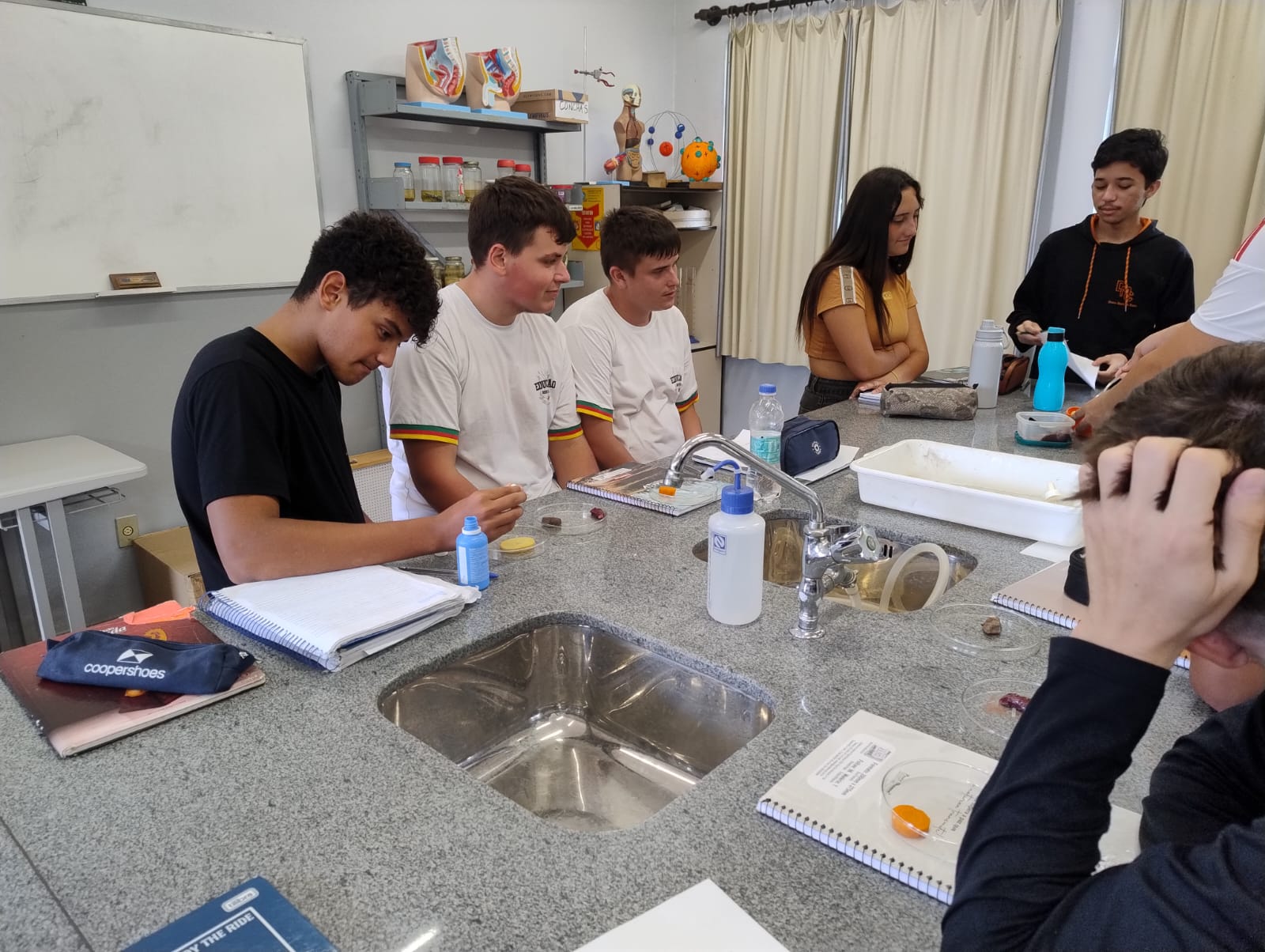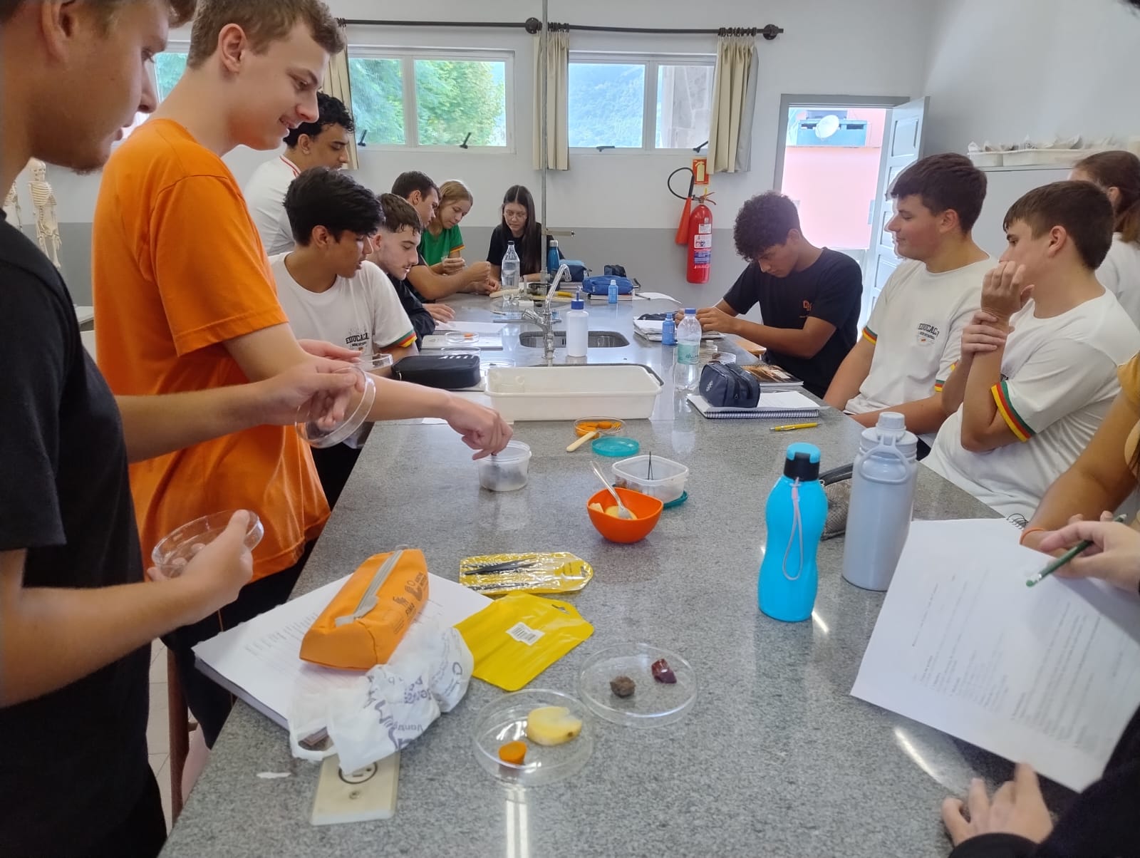 Atividades práticas com a Profª Danielle Bauer- 2 Published 19 de março de 2026 Atividade prática no laboratório: verificação da reação da água oxigenada com a enzima catalase presente em tecidos vivos, desenvolvida com a Turma 201.